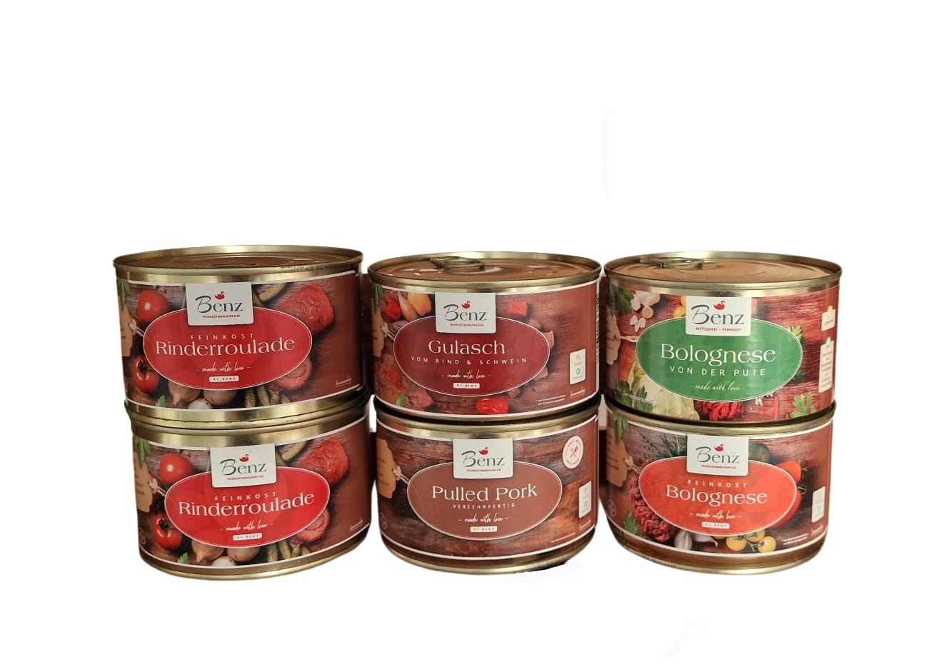 2 Dosen Pulled Pork, 2 Dosen gemischtes Gulasch, 2 Dosen Sauce Bolognese vom Schwein, 2 Dosen Putengeschnetzeltes, 2 Dosen Bolognese von der Pute, 2 Dosen Lyoner